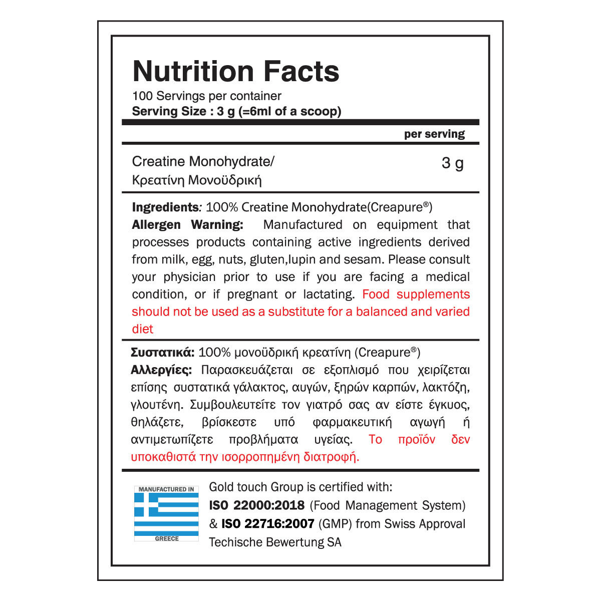 - 100% Μονοϋδρική Κρεατίνη- αποκλειστικά με πρώτη ύλη τη Γερμανική Κρεατίνη Creapure®