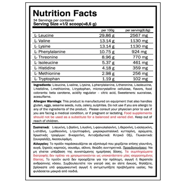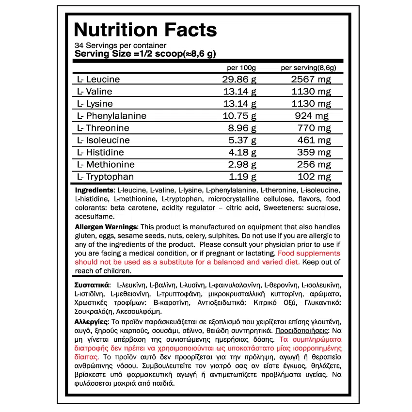 Η φόρμουλα EAA Complex (Essential Amino Acid) ξεχωρίζει για το ολοκληρωμένο προφίλ 9 απαραίτητων αμινοξέων που περιέχει. Με 4,5 g BCAA, ισορροπημένες αναλογίες L-φαινυλαλανίνης, L-Λυσίνης, L-Μεθειονίνης και άλλων αμινοξέων τα οποία ο οργανισμός δεν μπορεί να συνθέσει μόνος του, εξασφαλίζει υποστήριξη στην προπόνηση, μυϊκή ανάπτυξη και συνολική ευεξία.