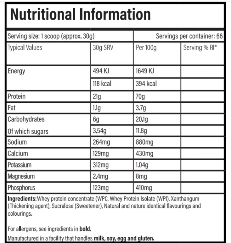 *Η περιεκτικότητα σε πρωτεΐνη μπορεί να διαφέρει ανάλογα με τη γεύση, με μέσο όρο περίπου 70% ανά 100γρ, και να φτάνει έως και 74% σε ορισμένες γεύσεις.